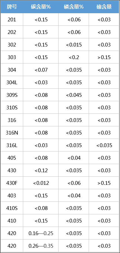 常用不銹鋼型號常用數字符號表示,有200系列,300系列,400系列,它們是美科的表示方法,如201,202,302,303,304,316,410,420,430等,中科的不銹鋼型號是用元素符號加數字表示,如1Cr18Ni9,0Cr18Ni9,00Cr18Ni9,1Cr17,3Cr13,1Cr17Mn6Ni5N 等,數字表示相應的元素含量。
